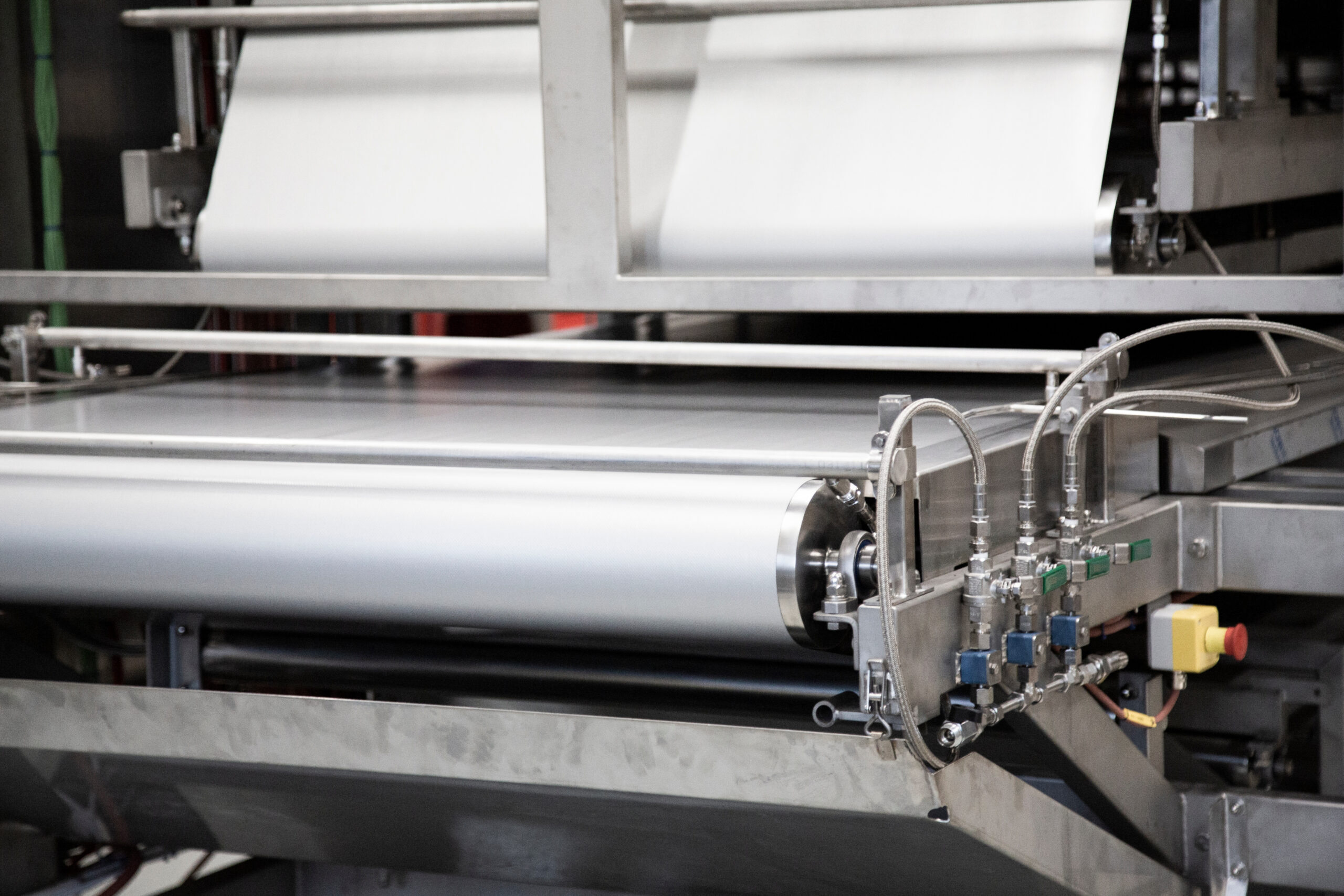 An upper and lower belt together with heating platens on each side of the product results in high capacity.