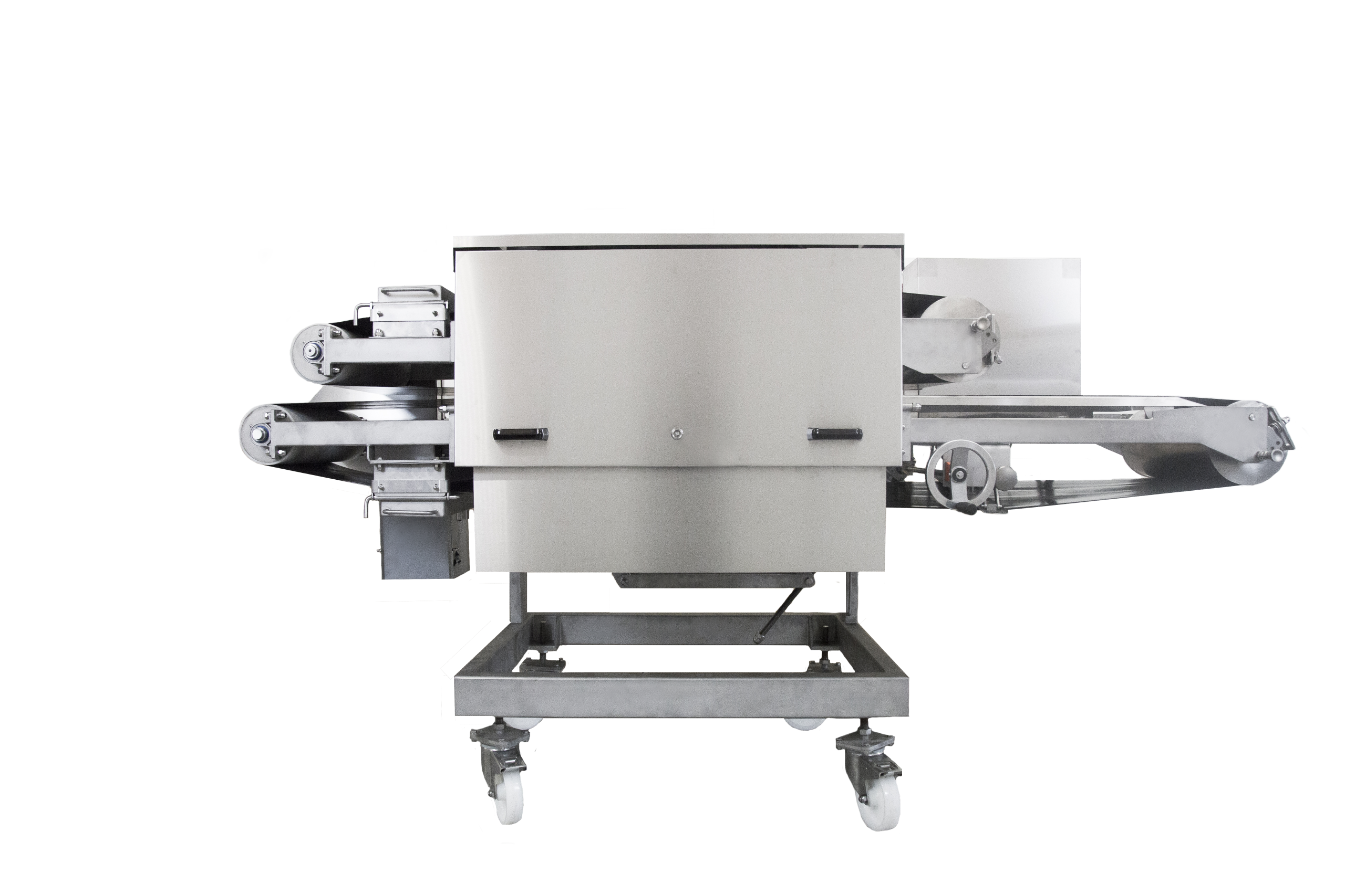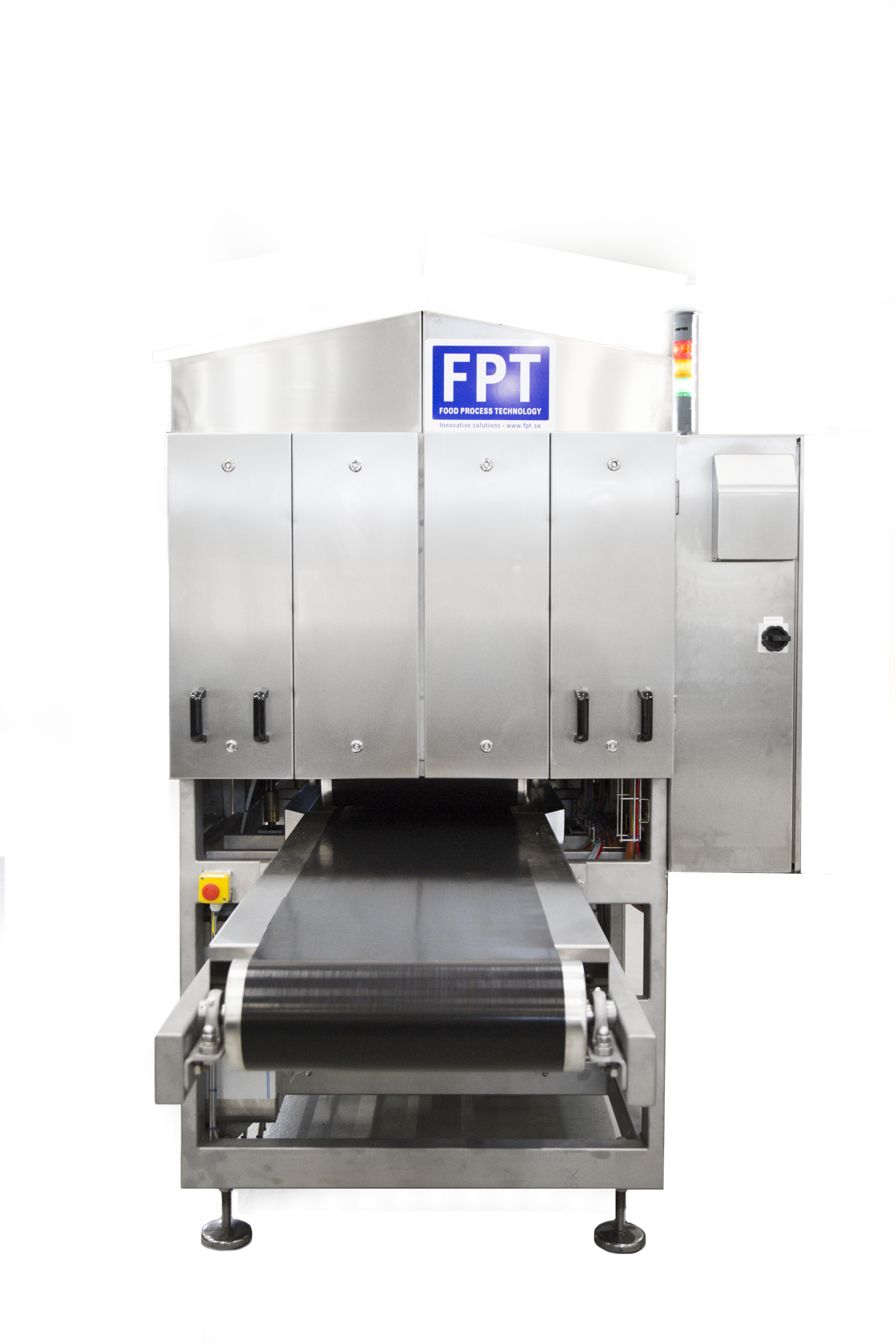 The products being cooked get a frying surface without losing weight, and the cooking itself is very fast. The speed of the PTFE-belt is adjustable, making the machine suitable for both cooking and pre-cooking. The belt is being cleaned with an inbuilt belt wash, maximizing the lifespan of the belt. The belt wash uses either hot water or steam.