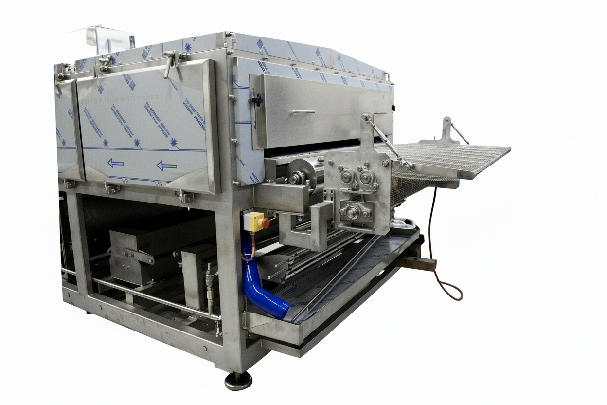 The products being cooked get a crispy surface without losing weight, and the cooking itself is very fast. The speed of the PTFE-belt is adjustable, making the machine suitable for both cooking and pre-cooking. The belt is being cleaned with an inbuilt belt wash, maximizing the lifespan of the belt. The belt wash uses hot water, steam or both.